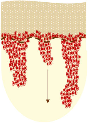 | Los queratinocitos atípicos se concentran en la capa basal de la epidermis | Pequeños brotes de queratinocitos atípicos de la epidermis basal protruyen ligeramente hacia la dermis papilar | Hay un patrón de crecimiento basal pronunciado con grupos de queratinocitos atípicos formando papilas elongadas que protruyen en la dermis |