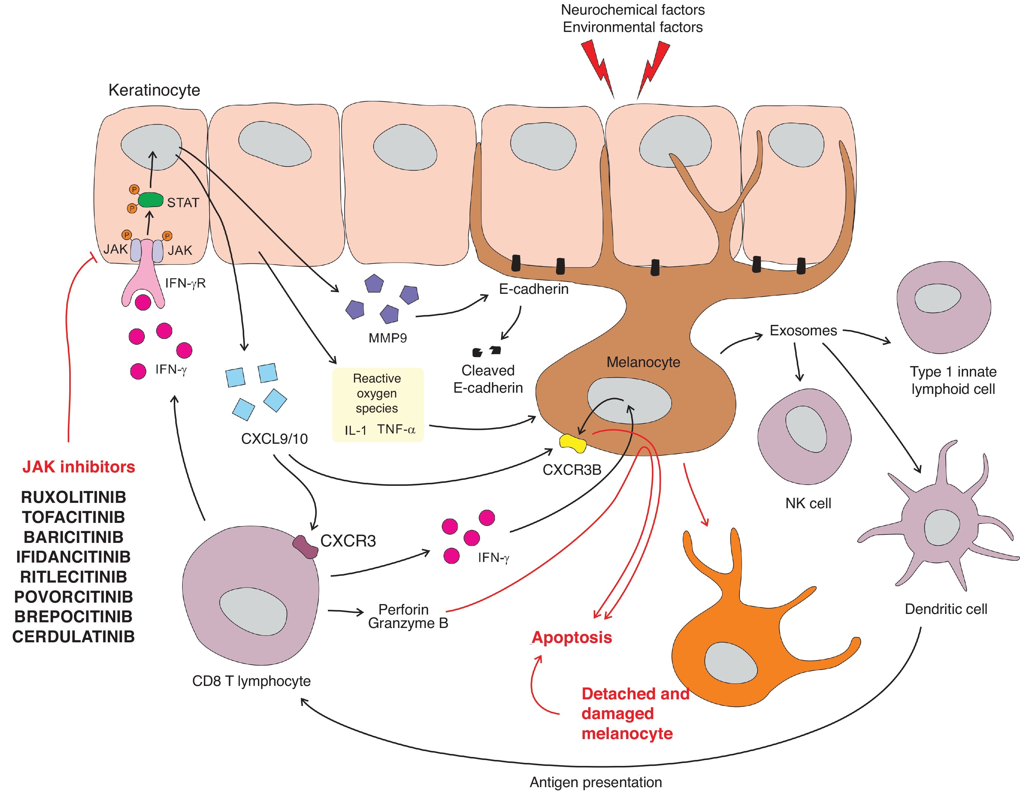 | Progression3. Initiation of the inflammatory IFN-γ – JAK1/2 – STAT1 – CXCL9/10 pathway.6,9,20,29–314. Recruitment of CD8+ T cells to the epidermis via the CXCR3 receptor.6,9,20,29,305. Progressive loss of melanocytes.6,9,20,29,306. Positive feedback loop (via CD8+ T cells, step 3).6,9,20,29,30 |