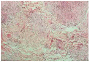 El examen histopatológico mostró granulomas no caseificantes, distribuidos irregularmente en la dermis, algunos muy superficiales, sin afectación de la epidermis, constituidos por un denso conglomerado de células epitelioides, células gigantes multinucleadas de tipo Langhans, rodeadas por un pequeño número de de linfocitos (fig. 2). No se observó necrosis caseificante ni necrobiosis.