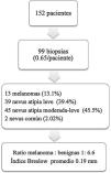 Durante el seguimiento se realizaron 99 biopsias con una media de 0,65 biopsias por paciente. Del total de escisiones 13 (13,3%) fueron MM, 39 (39,8%) nevus melanocíticos con atipia leve, 45 (45,5%) con atipia moderada-severa y dos (2,0%) nevus melanocíticos compuestos convencionales. Con respecto a los 13 melanomas, el índice Breslow promedio fue de 0,19 mm y el tiempo medio hasta el diagnóstico de estos fue de 4,7 años (± 3,7). En la cohorte estudiada, la ratio MM: lesión benigna extirpada fue de 1:6,61 (fig. 1).
