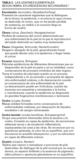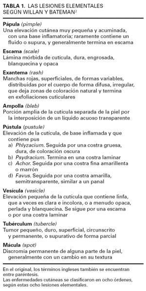 «Es preciso en la definición de cada una de estas lesiones (elementales) atenerse a un solo criterio uniforme: el criterio morfológico. No cabe diferenciar la pápula del tubérculo por el carácter resolutivo de la primera y el no resolutivo del segundo, pues en un momento determinado podríamos no poder precisar cuál va a ser esa evolución posterior».