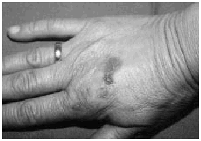 FIG. 1.--A nivel del dorso de la mano derecha se aprecia una ampolla y tres vesículas.