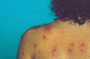 Las lesiones y los síntomas sistémicos del paciente mejoraron rápidamente tras la instauración del tratamiento, persistiendo algunas cicatrices hiperpigmentadas.