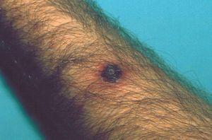 Figura 2. Lesión redondeada cubierta por una gruesa escamocostra serohemática.