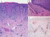 A) Estudio histológico: dermatitis liquenoide con borramiento de la capa basal, exocitosis neutrofílica e infiltrado linfoplasmocitario en banda, junto con numerosas células plasmáticas en la pared, y alrededor de los vasos de la dermis (Hematoxilina-eosina ×10). B) Estudio histológico: detalle de células plasmáticas perivasculares (Hematoxilina-eosina ×40). C) Estudio inmunohistoquímico positivo para Treponema pallidum.
