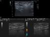 A. Imagen hiperecogénica localizada en tejido celular subcutáneo, de morfología arriñonada, ecoestructura homogénea de límite superior y laterales nítidos y pérdida de borde profundo por artefacto en tormenta de nieve. B. Dos imágenes hiperecogénicas adyacentes pseudoencapsuladas en «tormenta de nieve» en tejido subcutáneo. Ausencia de vascularización con doppler color.