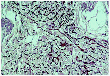 Fig. 2.--Aumento del grosor de las fibras elásticas en la dermis reticular. (Tinción con orceína, x100.)