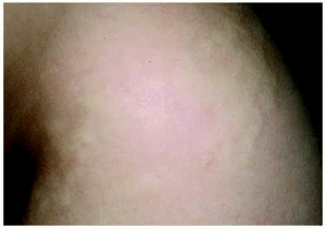 Un niño de 6 años de edad presentaba desde los 2 años unas lesiones blancas, asintomáticas, localizadas en la cadera izquierda. Con los años habían ido apareciendo nuevas lesiones en tronco, hombros y extremidades inferiores. Los padres no referían antecedentes de enfermedades inflamatorias de la piel en el área afectada y no había recibido tratamientos. Presentaba un desarrollo físico normal para su edad y como único dato de interés refería desde hace un año varios episodios de dolor nocturno en las plantas de los pies de aproximadamente un día de duración que cedía de forma espontánea sin tratamiento.
