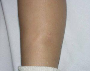 Fig. 3.--Pápulas agrupadas en la cara externa de la pierna.