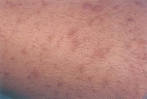 Fig. 4.--Caso 4. Lesiones de aspecto habonoso en las piernas.
