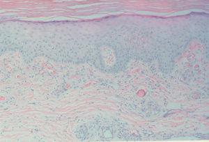 Presentamos 4 casos, mujeres, con una edad al diagnóstico de la enfermedad comprendida entre los 33 y los 89 años. Todos presentaban afectación de miembros inferiores aisladamente o en conjunción con otras localizaciones. La clínica cutánea fue variada: púrpura palpable, úlceras, placas equimóticas, ampollas hemorrágicas, lesiones eritematosas de aspecto livedoide o placas urticariformes (figs 1-4). Las lesiones eran sintomáticas y además una de las pacientes (paciente n.º 2) refería fatiga y artromialgias. En la tabla 1 aparecen reflejados edad, sexo, antecedentes personales y hallazgos clínicos de cada paciente. Las pruebas complementarias solicitadas incluyeron hemograma, bioquímica general con estudios de la función renal y hepática, estudio de coagulación, analítica de orina incluyendo sedimento, velocidad de sedimentación globular, complemento (actividad total, C3 y C4), factor reumatoide, anticuerpos antinucleares (ANA), anticuerpos anti-ADN de doble cadena, antígeno nuclear extraíble y anticuerpos anticitoplasma de neutrófilo, determinación de inmunoglobulinas séricas y electroforesis de las proteínas del suero. Además se solicitaron serologías luética, de virus de hepatitis B (VHB), C (VHC) e inmunodeficiencia humana (VIH). Se realizó determinación de criofibrinógeno y crioglobulinas con análisis del crioprecipitado. En todos los casos se realizó estudio histopatológico (fig. 5) e inmunofluorescencia directa.