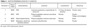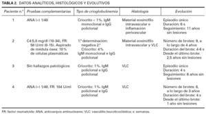 En cuanto a los hallazgos histopatológicos la manifestación más frecuente es la vasculitis leucocitoclástica. También ha sido descrito un patrón de panarteritis necrosante de vasos del tejido celular subcutáneo similar a la panarteritis nudosa 13. La presencia de un material amorfo eosinófilo intravascular sin datos de vasculitis es más frecuente en la crioglobulinemia tipo I 11, sin embargo este hallazgo no es específico de este tipo como demuestra el caso de nuestras pacientes n.º 1 y 2 que presentaban este dato histológico asociado a una crioglobulinemia tipo II.