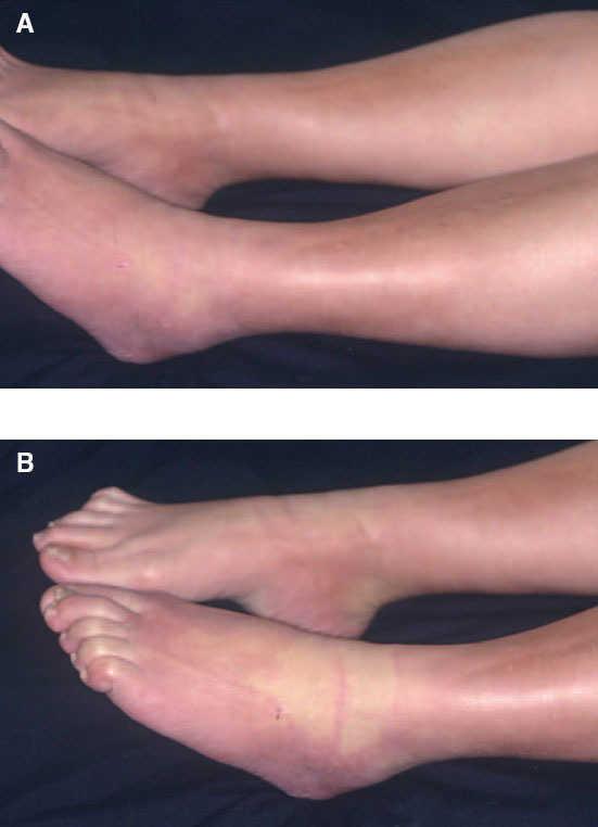 Fig. 2.—A) Placa indurada eritematosa pardusca mal delimitada en el dorso de los pies y en la zona distal de las piernas. B) Palidez en la zona anterior del tobillo al realizar la flexión plantar.