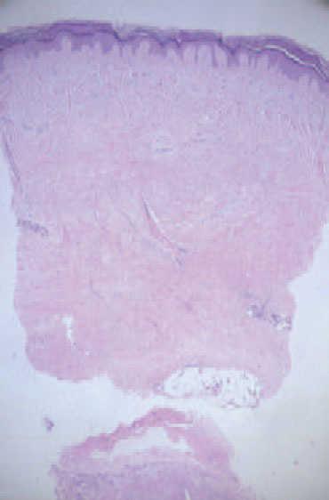 Se realizó una biopsia cutánea, en la que se evidenció un ensanchamiento de la dermis con haces de colágeno alargados y engrosados, atrapamiento de las estructuras anexiales y escasa celularidad (fig. 3).