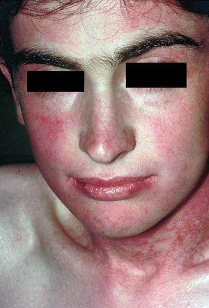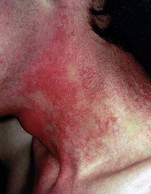 Fig. 1.--Atrofia, eritema y telangiectasias en mejillas y región cervical anterior.