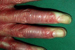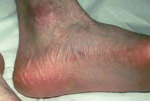 En el momento actual, a la exploración física el paciente presentaba placas poiquilodérmicas en la cara (figs. 1 y 2) y en los laterales del cuello (fig. 3), con áreas atróficas, telangiectásicas y esclerodermiformes. En ambas manos y pies, era evidente la esclerodactilia con afilamiento distal y cianosis digital, así como una leve onicodistrofia en las láminas ungueales (fig. 4). En la cara palmar era más llamativa la atrofia cutánea, con piel fina y lisa como papel de fumar y formación de pseudosindactilia (fig. 5). En las plantas de los pies, además, se apreciaban pápulas queratósicas o pits (fig. 6).