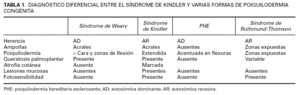 El diagnóstico diferencial de la poiquilodermia acroqueratótica y el síndrome de Kindler incluye todas las genodermatosis en las que se observa poiquilodermia como característica clínica prominente, incluyendo la poiquilodermia esclerosante hereditaria, el síndrome de Rothmund-Thomson, el xeroderma pigmentoso, la disqueratosis congénita, el síndrome de Mendes da Costa, la dermatopatía pigmentosa reticular, el síndrome de Franceschetti-Jadassohn y el síndrome de Degos-Touraine, fundamentalmente (tabla 1) 7.