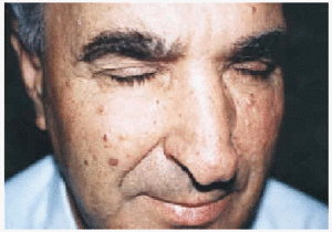 Un varón de 60 años, con antecedentes personales de hipertensión arterial, accidente cerebrovascular em-bólico, epilepsia secundaria y cirugía de sustitución de válvula mitral; fue intervenido en 1989 de queratoacantoma en frente. Diez años después acude de nuevo a consulta por queratoacantoma nasal y en sien izquierda, de los cuales fue intervenido.