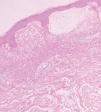 Fig. 3.--Intenso infiltrado dérmico neutrofílico y formación de una ampolla subepidérmica a consecuencia del fuerte edema. (Hematoxilina-eosina, x20.)