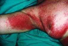 Aunque algunos autores (36) piensan que las lesiones clínicas asociadas a la SEE inducida por quimioterapia no muestran preferencia alguna para una localización en particular, el número de casos con una manifestación clínica característica ha aumentado (28, 34, 35, 38, 39). Santa Cruz y cols. (28) observaron la presencia de SEE en una serie de 10 pacientes con eritema acral después de quimioterapia a altas dosis. Mientras Rongioletti y cols. (35) describieron otro caso de SEE con eritema acral, uno de los cuatro casos que publicaron Bhawan y cols. (34) presentó áreas de eritema con pequeñas vesículas afectando predominantemente las ingles. Por último, nosotros (38, 39) describimos recientemente SEE en una serie de 10 pacientes con una erupción clínicamente característica que apareció durante o después de un tratamiento de acondicionamiento con altas dosis de quimioterapia previo al trasplante de médula ósea o trasplante autólogo de células progenitoras de sangre periférica (TASPE). La erupción afectó principalmente las axilas, ingles y palmas y/o plantas. La SEE se asociaba a una dermatitis de interfase vacuolar. En el mismo año, Prussick y cols. (48) describieron tres pacientes con una erupción parecida después de recibir quimioterapia a altas dosis previa a un TASPE.