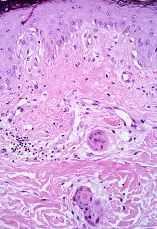 En la comparación entre grupo 1 y grupo 2, cinco parámetros mostraron diferencias significativas (tabla IV). En los casos del grupo 2 había una mayor frecuencia de degeneración hidrópica --93,0% frente al 6,3% (p = < 0,0001)--, cambios madurativos --46,5% frente al 6,3% (p = 0,010)-- (Fig. 10), edema en dermis papilar --100% frente al 6,3% (p < 0,001)-- y un plexo vascular dilatado en dermis papilar --100% frente al 6,3% (p < 0,001)--. La presencia de un infiltrado inflamatorio en dermis fue observado también con mayor frecuencia en grupo 2 --100% frente al 75% (p = 0,004)--. Sin embargo, no había diferencia significativa en intensidad del infiltrado entre ambos grupos.