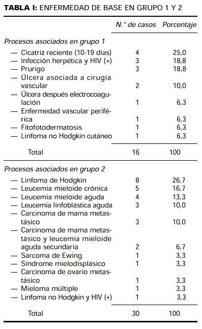En todos los pacientes incluidos se evaluaron los siguientes parámetros generales: si habían recibido quimioterapia, sexo, edad, enfermedad de base, número de leucocitos totales en sangre (valorados en el inicio de la erupción y en el momento de la biopsia).