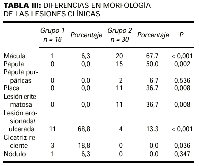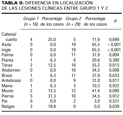 Encontramos diferencias estadísticamente significativas en la afectación de axilas (p < 0,0001), ingles (p < 0,0001), palmas (p = 0,004), tórax (p = 0,013), abdomen (p = 0,008), brazo (p = 0,033), antebrazo (p = 0,017) y nalgas (p = 0,018). Todas estas localizaciones menos las nalgas fueron afectadas con mayor frecuencia o exclusivamente en el grupo 2 (tabla II).