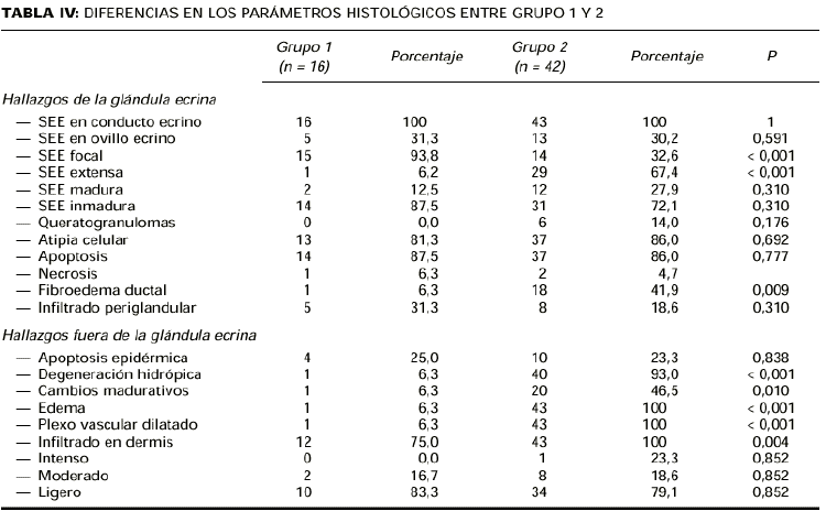 Dentro de la glándula ecrina se analizó la localización, extensión y maduración de la SEE. La SEE se consideró extensa si había más de un conducto ecrino afectado en una longitud epidérmica de corte de 2-6 mm y más de dos en una longitud mayor de 6 mm. La SEE fue clasificada focal si había un menor número de conductos afectados que lo establecido para cumplir el criterio de extensa. La SEE fue clasificada madura cuando se apreciaba queratinización intraductal e inmadura cuando no había signos de ella.