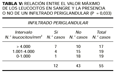 La relación entre el valor máximo de los leucocitos totales en sangre y el número de casos con infiltrado periglandular era estadísticamente significativa (p = 0,033) (tabla V). Un caso diagnosticado de LMA subtipo 5 tenía una leucopenia severa y HEN. Se excluyeron cuatro casos sin análisis.