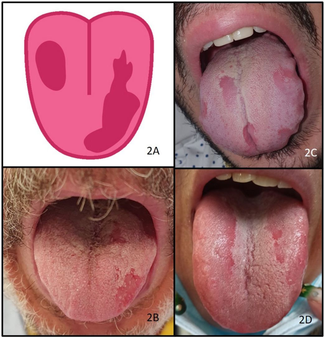 Pacientes con enfermedad por COVID-19 con glositis con depapilación en parches (3,9%). A) Ilustración de la glositis con depapilación en parches observada en pacientes COVID-19. B-D) Pacientes que presentaban glositis con depapilación en parches. Los cultivos para hongos y las serologías fueron negativos.