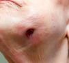 Physical ExaminationThe left perimandibular region was swollen, erythematous, and indurated to palpation, with a submandibular, ulcerated, fistulous area of retracted skin, from which a seropurulent exudate drained. Within this area was a fleshy excrescent papule (Fig. 1). Examination of the oral cavity revealed teeth in poor condition.