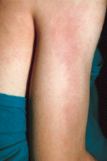 Niño de 12 años de edad remitido a nuestro Servicio por presentar una erupción cutánea eritematosa de 2 años de evolución, que afectaba inicialmente a la región del omoplato izquierdo y que de forma lenta y gradual se extendió al hombro, brazo, antebrazo y primer dedo de la mano del mismo lado. Entre sus antecedentes personales destacaba únicamente una polinosis en tratamiento inmunoterápico. El paciente refería prurito generalizado en relación con los baños con agua caliente y con los cambios bruscos de temperatura, así como episodios aislados de rubor facial. En la consulta se realizó un interrogatorio dirigido en el que se descartó otra sintomatología acompañante como dolor abdominal, náuseas, vómitos, diarrea, pérdida de peso, mareos, cefaleas, dolor torácico y palpitaciones, así como la toma de otros medicamentos o drogas.