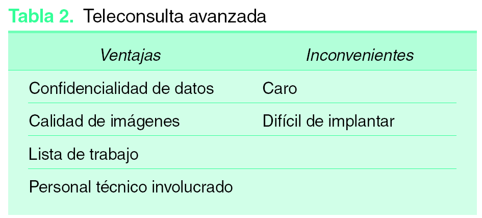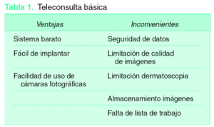 Para realizar una teleconsulta, solamente es necesaria una cámara fotográfica y una conexión a Internet. Esta es la forma más sencilla, barata y frecuente de realizar teledermatología, ya que es un sistema fácil de implantar, pero plantea inconvenientes como la confidencialidad de datos de los pacientes. Este problema es parcialmente resuelto, por ejemplo, con las compresiones en win.rar (programa informático que comprime las fotografías de tamaño y que precisa de contraseña para poder visualizar los archivos), pero no son programas que hayan sido supervisados por la Food and Drug Administration (FDA) ni validados por la Unión Europea. Otros problemas que plantea son las limitaciones con la calidad de las imágenes, para el almacenamiento de los datos y para la creación de una lista de trabajo12,13. Este sistema de teledermatología es eficaz, pero actualmente la tecnología ha evolucionado lo suficiente para que dispongamos de sistemas muchos más avanzados (tabla 1).