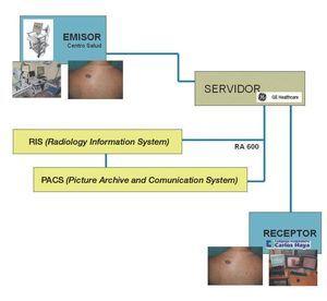El segundo frente donde avanza la teledermatología es en la forma de intercambiar y almacenar la información desde el centro que envía las imágenes. Actualmente los hospitales tienden a contratar sistemas PACS (sistema de almacenamiento y comunicación de imágenes médicas). Éstos son servidores informáticos donde se almacenan las imágenes e información de los pacientes. Estos sistemas se han implantado en un principio en los Servicios de Radiología, pero aplicando la misma tecnología se aprovechan para incorporar imágenes dermatológicas. Junto con el PACS tenemos el sistema RIS (sistema de información radiológica) que es un sistema de información que gestiona la lista de trabajo, donde escriben los informes los médicos especialistas y se tramitan las citas (fig. 2).
