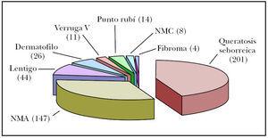 Figura 8. Patología tumoral benigna. NMA: nevus melanocíticos adquiridos; NMC: nevus melanocíticos congénitos.