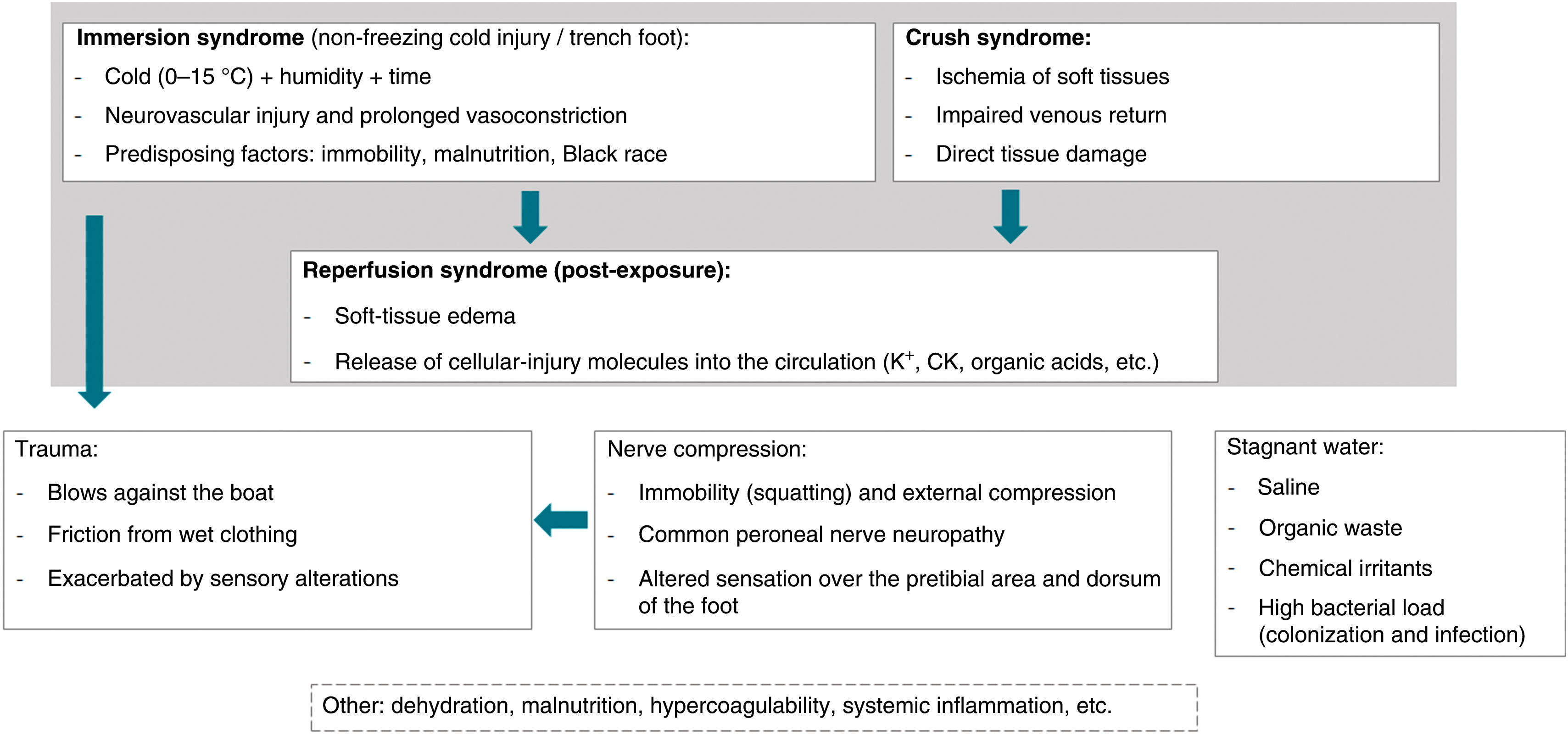 Proposed pathophysiology of patera-associated skin and soft-tissue syndrome. Non-freezing cold injury (immersion/trench foot) from prolonged exposure to 0–15°C and humidity causes neurovascular damage and sustained vasoconstriction; fatigue, malnutrition, dehydration, immobility, and Afro-Caribbean ancestry are predisposing factors. Crush injury leads to soft-tissue ischemia, direct tissue damage, and impaired venous return. Subsequent reperfusion of previously hypoperfused areas triggers soft-tissue edema and systemic release of damage-associated molecules, worsening the condition. Trauma from wave motion and friction with clothing/boat causes cutaneous injury, exacerbated by cold-related sensory alteration and peripheral neuropathies. Compression of the common peroneal nerve – typically from prolonged squatting or external compression – is another factor, partially explaining pretibial and dorsal-foot lesions. Boat bilge water contains stagnant salt water, organic waste, chemical irritants, and high bacterial loads, favoring colonization/infection. Other contributors include malnutrition/dehydration, systemic inflammation, and hypercoagulability.