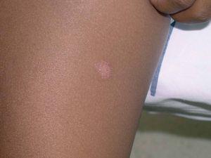 Fig. 1.--Placa descamativa en el muslo derecho.