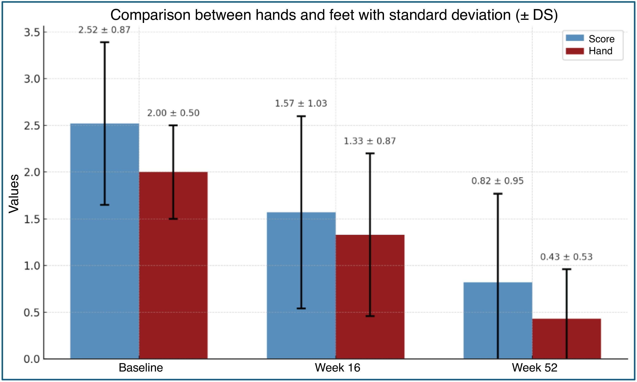 At baseline, the mean EASI score was 23.60±4.44 (Fig. 1), reflecting severe disease. The PGA indicated moderate-to-severe involvement of the hands (2.52±0.87) and feet (2±0.5) (Fig. 2). At week 16, 76.19% of patients showed improvement in hand PGA, increasing to 81.2% at week 52. For foot PGA, improvement rates were 66.6% and 71.4%, respectively.
