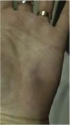 Physical ExaminationPhysical examination revealed macules of varying sizes, some bluish with an ecchymotic appearance, on the dorsal aspect of a finger and on the palm of the hand (Figs. 1 and 2). Hand temperature was normal and arterial pulses were present.