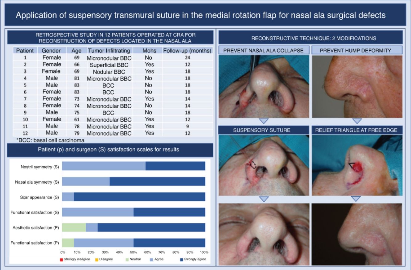 La reconstrucción de la pirámide nasal presenta un desafío significativo debido a su complejidad anatómica y la necesidad de preservar la funcionalidad de la válvula nasal interna y mantener la simetría facial. Presentamos un estudio retrospectivo de 12 casos en los que se empleó un colgajo de rotación alar para la reconstrucción de defectos quirúrgicos localizados en el ala nasal, describiendo las claves fundamentales del procedimiento y algunas consideraciones prácticas dirigidas a prevenir el estrechamiento de la narina y la asimetría alar. Por otro lado, se evaluaron los resultados funcionales y estéticos, revelando la ausencia de complicaciones y una alta satisfacción durante el seguimiento, lo cual aporta una valoración objetiva de los resultados. Estos hallazgos confirman la viabilidad del colgajo de rotación alar como una opción efectiva y versátil, especialmente para abordar pequeños defectos del ala nasal. Además, proponemos dos estrategias para mejorar tanto los resultados funcionales como estéticos.