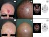 Patient #2 (c-d): loco-regional recurrence in the form of multiple satellitosis in a patient with a past medical history of primary MCC on the scalp. Image C shows multiple erythematous-violet papules and nodules corresponding to loco-regional cutaneous metastases (the patient also exhibited loco-regional lymph node involvement). Image D shows the complete disappearance of all cutaneous lesions after 7 cycles of avelumab plus loco-regional adjuvant radiotherapy.