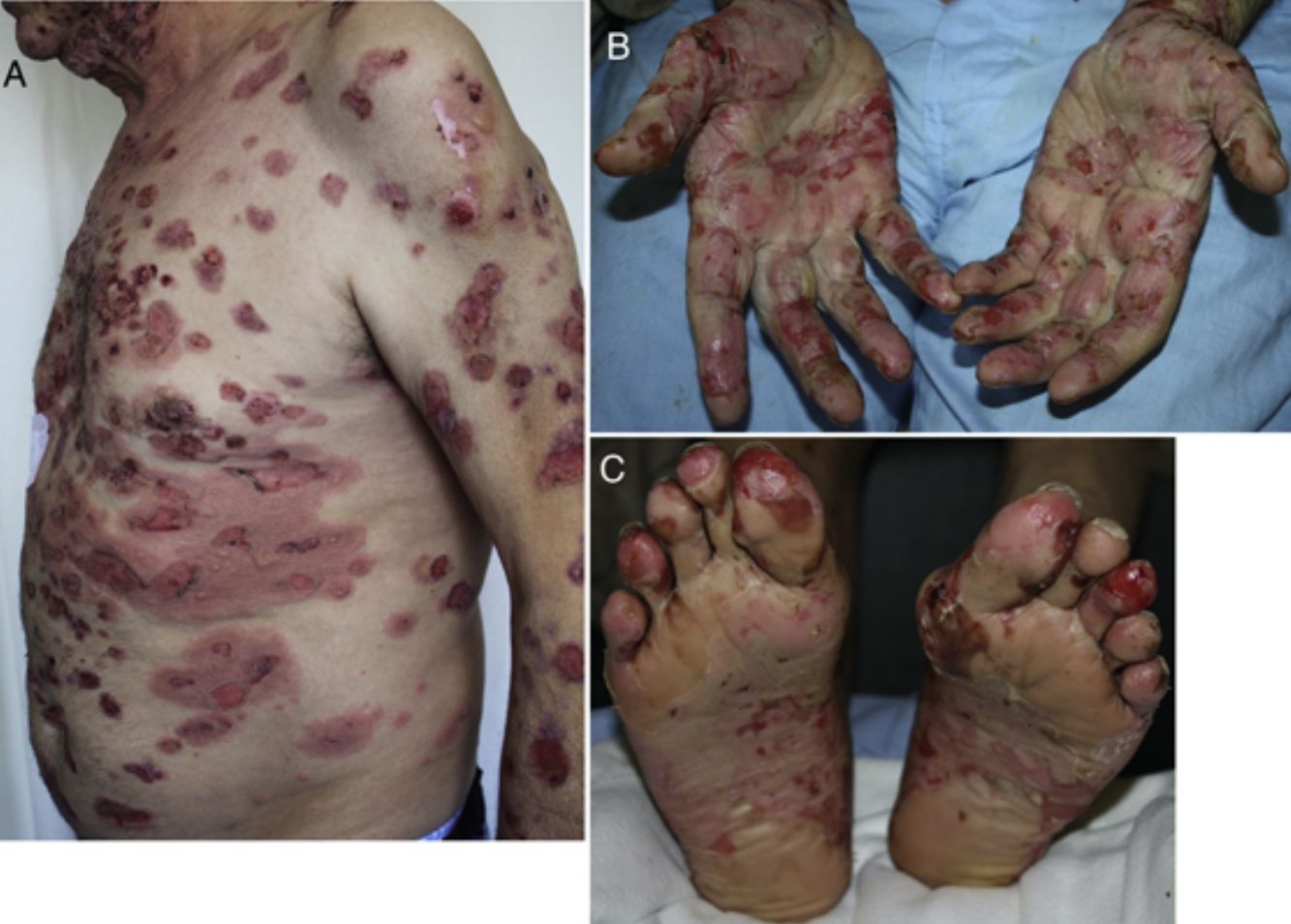 Developing 6 months after start of treatment (range, 2 weeks to 25 months),19,25,56,57,59–61 these reactions have a typical clinical picture of intense pruritus, erythema, edema, and tense blisters filled with clear fluid. They may be scattered over any part of the body (Fig. 3, A–C), localized, affect mucosal surfaces, or progress without blistering.56,60,62 There is usually a prebullous phase of a few weeks (in 34.5%) or a period with pruritus but no lesions.25,57,60,61 Subepidermal blisters rich in eosinophils are a typical finding in biopsied tissue, and direct immunofluorescence shows linear IgG and C3 deposition.20,56,60,61,63