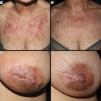 Images of cases with CLE of the ACLE and LEP subtypes prior to anifrolumab therapy (a) and after 2 infusions of anifrolumab 300mg/month (b). Image set 1 corresponds to case report #4 in the table and shows ACLE lesions presenting as erythematous and edematous plaques in a sun-exposed area (décolletage), with acute onset, that heal without scarring after treatment. Image set 2 corresponds to case report #2 and shows lupus mastitis (LEP) lesions characterized by indurated, infiltrated, scaly plaques with deep, fissured involvement that resolve leaving a scar after treatment.