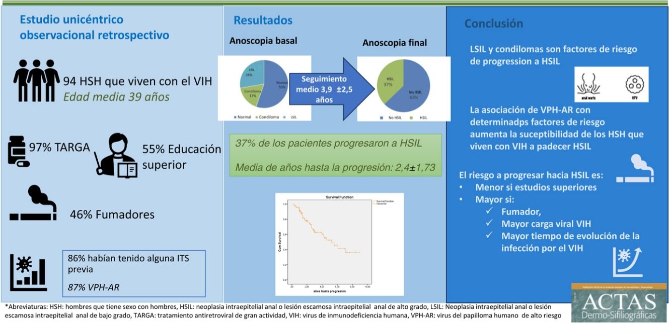 Materials and methodsWe conducted an observational, retrospective, unicentric study to evaluate a cohort of MSM living with HIV, who were followed using high-resolution anoscopy (HRA) in a screening unit. In this sample, our aim was to identify factors associated with the progression to HSIL based on whether patients presented with LSIL at their first consultation in the unit.