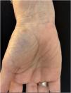 A 66-year-old woman presented with intense generalized itching after a trip abroad. Physical examination and manual dermoscopy confirmed the presence of multiple mite burrows (fig. 1) followed by a symmetrical papular eruption on the trunk and thighs. Subsequently, using a 365nm ultraviolet (UV) lamp, bright white-bluish structures corresponding to different parts of the mite burrow were seen, which supported the diagnosis of scabies (fig. 2).