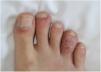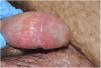 Regarding the mucosal expressions observed in our research, circinate balanitis (fig. 1, case #3) was observed in 5 patients (71.4%), while 3 of the 7 subjects (42.8%) exhibited recurrent oral ulcers. One of them had nail dystrophy associated with typical keratoderma blennorrhagicum (14.2%), whose histological study revealed psoriasiform epidermal hyperplasia, spongiform pustules, neutrophilic exocytosis, and a lymphohistiocytic perivascular inflammatory infiltrate in the superficial dermis. Case #3 presented with multiple psoriasiform plaques on the forearms associated with dactylitis (fig. 2). Dactylitis was present in 2 of the 7 patients along with joint symptoms. Three patients (42.8%) exhibited conjunctivitis during the course of the disease.