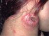 Dada la rápida evolución de la enfermedad, en abril de 1999 la paciente inició un tratamiento quimioterápico con 3 ciclos de MEGA-CHOP (ciclofosfamida, adriamicina, vincristina y prednisona) asociado a la administración de G-CSF (factor estimulador de colonias de granulocitos), obteniéndose una escasa respuesta al mismo. Debido a las características de la paciente y a la gran agresividad del linfoma se decidió realizar un trasplante autólogo de progenitores hematopoyéticos (TAPH), procedimiento que fue llevado a cabo en noviembre de 1999. Previamente fue sometida a tratamiento de rescate siguiendo el esquema ESHAP (etopósido, citarabina en dosis elevadas, cisplatino y metilprednisolona) en un total de 4 ciclos. Se recogieron progenitores autólogos tras la movilización con ciclofosfamida y G-CSF. El tratamiento de acondicionamiento del TAPH siguió el esquema BUCY2 (busulfán y ciclofosfamida). Se realizó profilaxis con mesna y fenitoína para prevenir la aparición de cistitis hemorrágica y crisis comiciales, respectivamente. La paciente presentó una buena tolerancia y una buena respuesta al tratamiento, a pesar de lo cual, las lesiones reaparecieron en forma de placas en enero de 2000, pero sin asociar adenopatías clínicamente ni por técnicas de imagen (estadio I-B) (fig. 4). Estas lesiones se trataron con mostaza nitrogenada y corticoides tópicos, seguidos de PUVA e interferón (IFN) alfa-2b hasta un máximo de 4,5 MU 3 veces por semana. Asimismo, fue precisa la aplicación de radioterapia local, en varias ocasiones, debido al rápido crecimiento de las lesiones tumorales de predominio en la región cefálica (año 2001) (estadio II-B) (fig. 5).
