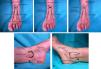 Inervación sensitiva de los nervios tibial posterior (amarillo), peroneo profundo (verde), peroneo superficial (magenta), safeno (azul) y sural (rojo). A: Cara dorsal del pie izquierdo. B: Cara plantar del pie izquierdo. C: Cara lateral interna del pie izquierdo. D: Cara lateral externa del pie izquierdo.