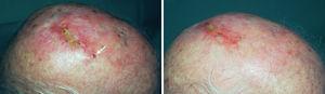 Fig. 1.—A) Nódulos tumorales metastásicos múltiples en el cuero cabelludo. B) Respuesta clínica favorable con desaparición de los nódulos tras el tratamiento tópico con imiquimod.