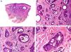 Histopathologically, syringocystadenocarcinoma papilliferum is similar to its benign counterpart, as it is formed by large papillary structures. Unlike syringocystadenoma papilliferum, however, it appears as an asymmetric, poorly circumscribed tumor that invades the hypodermis and underlying tissues. Papillary structures penetrate cystic cavities, which are connected to the skin surface through pre-existing infundibular structures and are lined by an epithelium with clear signs of atypia and frequent mitotic figures (Fig. 3).17